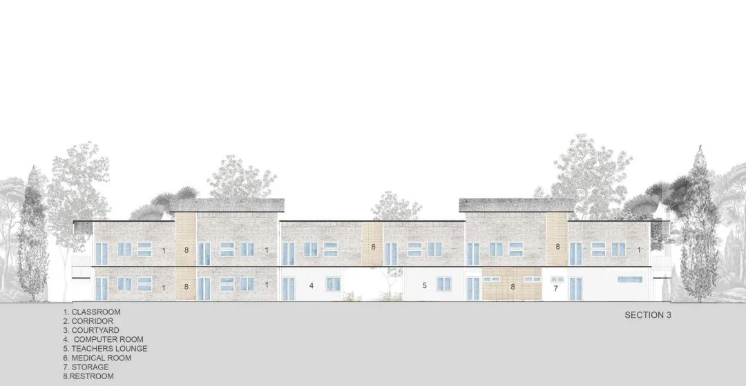 建筑物从四面八方都是开放的,没有后面也没有前面。地面层不仅仅是一个封闭的功能,我们称它为开放的广场–中间的空隙为自由空间。建筑周围有许多白杨树园,我们不需要它们在建筑中。上层是班级,像一个小村庄一样排列。每个班级都有两边的通道,自然采光和通风。百叶窗系统保护他们免受阳光和海风的影响。
