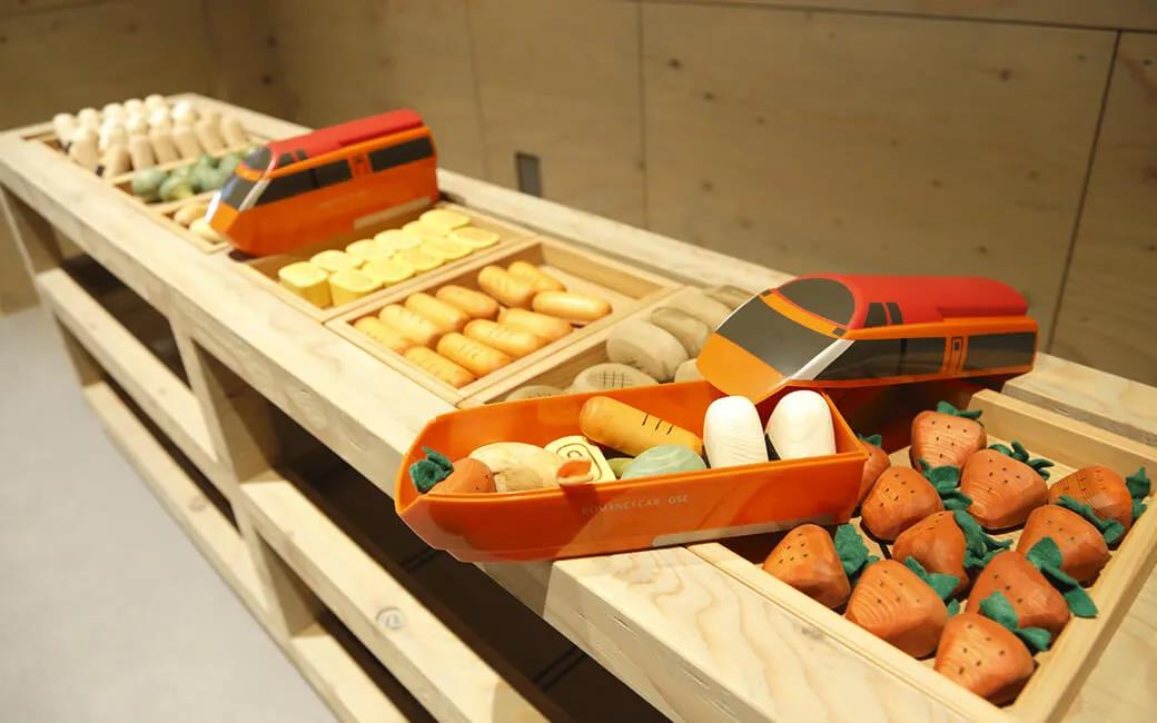 孩子们可以使用“浪漫”特快列车实际使用的便当盒,自由选择搭配放入木制食材玩具,进行便当制作游戏。