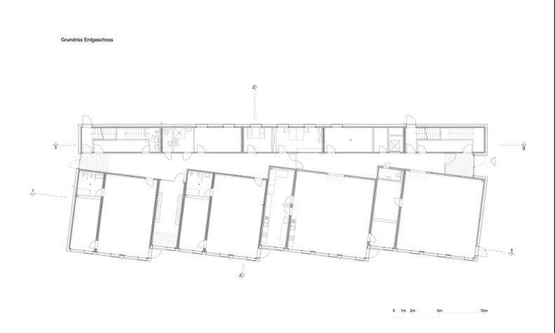 在混凝土板上,仅使用木材作为结构和设计材料。这既体现了室内空间又体现了建筑的氛围。尤其值得一提的是,尽管模块设计很严格,但平面图却偏离了正交网格。通过略微旋转和偏移模块,建筑以俏皮的优雅向外部开放。