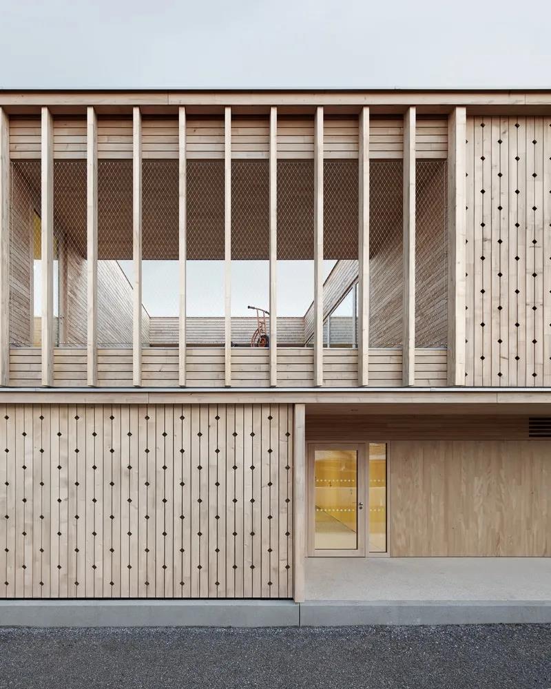 该建筑是木材和混凝土的混合建筑,可以满足当今的能量学和生态环保的要求。尤其是在可持续性方面,由木材,矿物材料制成的坚固外表皮和精心调和的色彩使房间具有令人愉悦的感官和空间体验,使孩子和教育者有足够的自由发展余地。加固的混凝土墙体结构和由木材制成的天花板元素相互补充。高能效的建筑技术系统以及可再生能源的使用,既可以保护自然和环境,也为可持续发展做出积极的贡献。