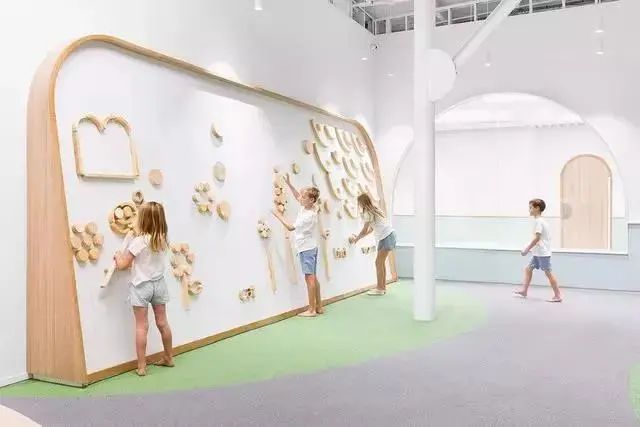 此空间中,设计师将纯粹的白色配上温暖的木材,借以消除空间的压迫性。木质的小板凳方便了大人与孩子的休憩与交流;开放性的空间激发着小朋友们的思考和创作潜能。同时又提供了一个多变而安全的环境来满足小孩与生俱来的好奇心,以此鼓励小朋友发问和探索。