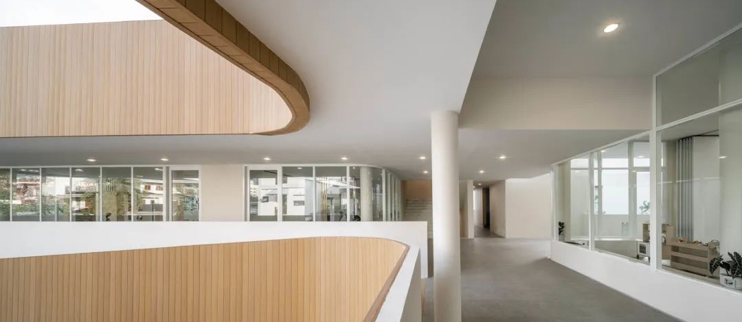 所有空间的体量和平面都采用了倒角来软化空间,此外,木条被白色的体量所包裹,以分隔主要空间和流通空间。典型的学习室可以让教师在固定的墙面上使用教学媒体,但却限制了儿童的想象力,HEI学习空间的设计是为了激发儿童的创造力,这里有一个大的单一空间,可以通过使用活动隔断分成4个空间,此外,倾斜的空间被透明墙包裹。