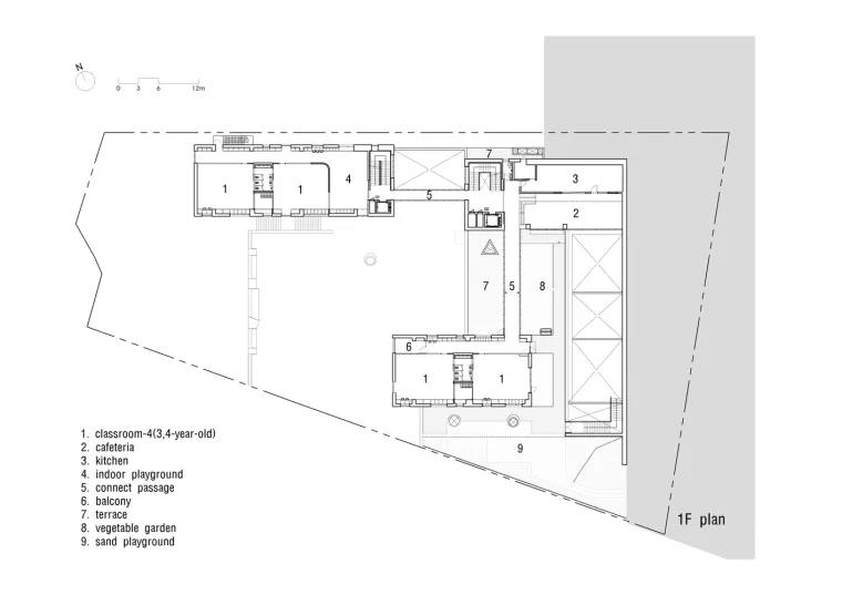 儿园教室都有一个前院。三百名学生被分成三个不同的建筑单元,通过一个地下平台相互连接。
