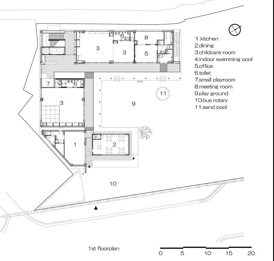 在这个项目之中,我们计划增加一个咖啡馆,它独立于幼儿园,可以向附近社区开放。这家咖啡厅的功能是成为家长和孩子相互交流的场所,在这里可以停下来喝杯茶,感受自由,在接孩子的时候增加父母间的交流。它也可以作为当地居民互动的场所。因此,咖啡厅位于幼儿园和接送点间,连接两地。另外,由于所有的窗户都可以在面向校园的侧打开,来接孩子的家长可以看到孩子们在校园里面玩耍。