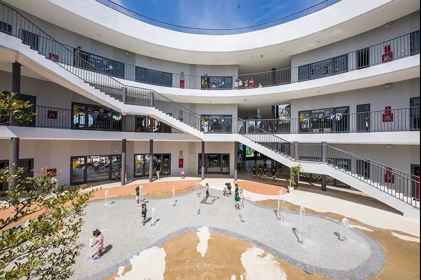 建筑结构形成三个不同的小操场,中央设置有小树林,将空间与自然联系起来。室外空间的建筑理念是——金、木、水、火、土。这些室内外的运动场、游戏区和游泳池也有助于身体成长,鼓励健康的生活方式。