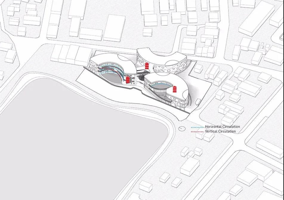 为了使建筑与四周的城市景观相协调,建筑的弧形结构使相邻湖泊的景观最大化,同时将内部空间与每个不同的操场连接起来。几扇彩色圆形窗的高度和尺寸各不相同,满足了不同年龄段孩子的需求。白色背景之上强烈的彩色窗框使其成为吸引儿童的地方。