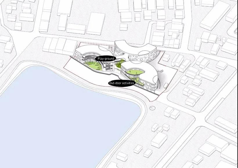 有机的形状,简单的建筑线条,最基本颜色,不同高度的外墙窗户都是考虑到孩子们的成长需求。