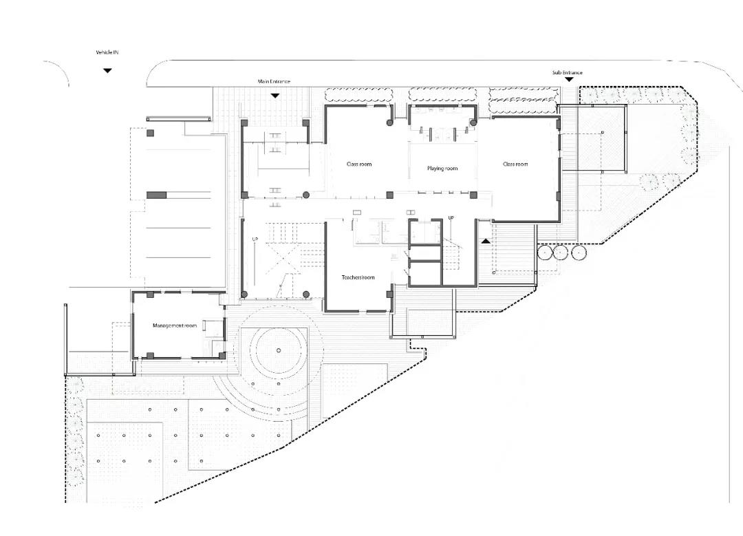 幼儿园是孩子们创造梦想和想象力的空间。幼儿园里的孩子们就像白纸一样有着无限的发展潜力。设计师对这座建筑没有定义刚性的形式和空间,整座幼儿园由白色立方体三维堆砌而成。