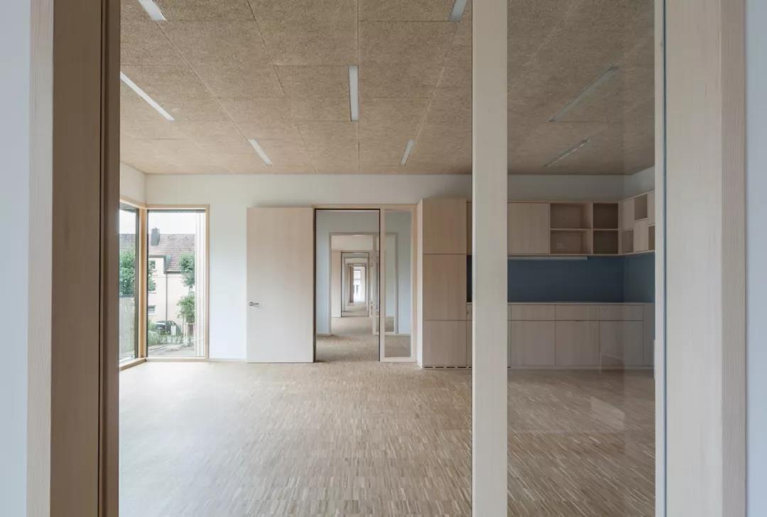 在二楼,通往每个房间的走廊通过衣帽间和集体活动室的墙面产生节奏感。每个空间的连通性和开放性为孩子们创造了各种接触和交流的空间。