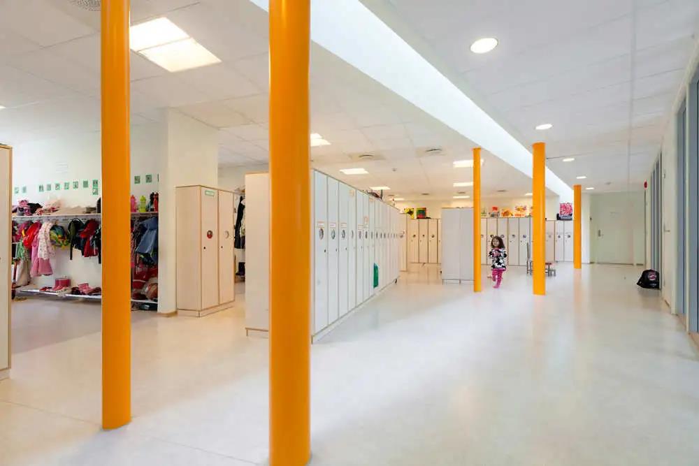 进入幼儿园,首先会来到一个中央圆形空间,这是整座建筑的主要核心。幼儿园采用非传统的平面结构,像花瓣,不同的结构像扇子一样从中心向周围辐射。