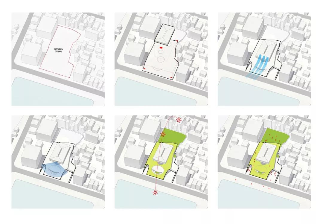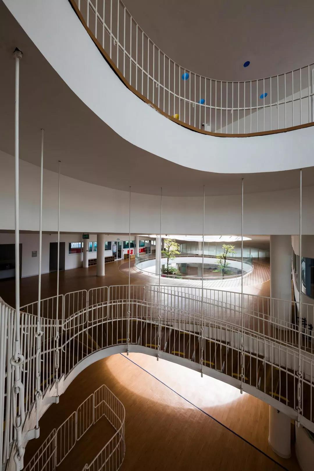 在这个多功能厅里面有一个大型的游乐场,开放的格局使空间与其他部分紧密相连,这是孩子们和家长们都可以互动的理想场所。槟城是相对平坦的地区。建筑的山丘造型给城市带来了更多的起伏,非常新颖。场地面向Trúc Giang 江湖,因此建筑从西向东逐渐升高,并在斜坡底部放置一个方形体量。这种处理的方式,改变了现有的城市结构,使幼儿园的氛围更加活跃。四周居民和山坡之上玩耍的孩子间也有视觉交流。可以说,这座建筑不仅对自然开放,而且巧妙地融入了社区。