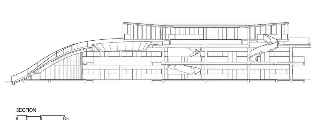 幼儿园由两个独立的部分组成:一个是山坡和山坡之上有一个规则的几何体。这一规则体量为儿童艺术培训和室内活动提供了一个高品质的空间,为全景城市景观提供了理想的观赏点。体量顶部的“山坡”空间是幼儿园的核心组成部分。这些教室包括由大型多功能厅连接的教室,用于日常和特殊教育活动。