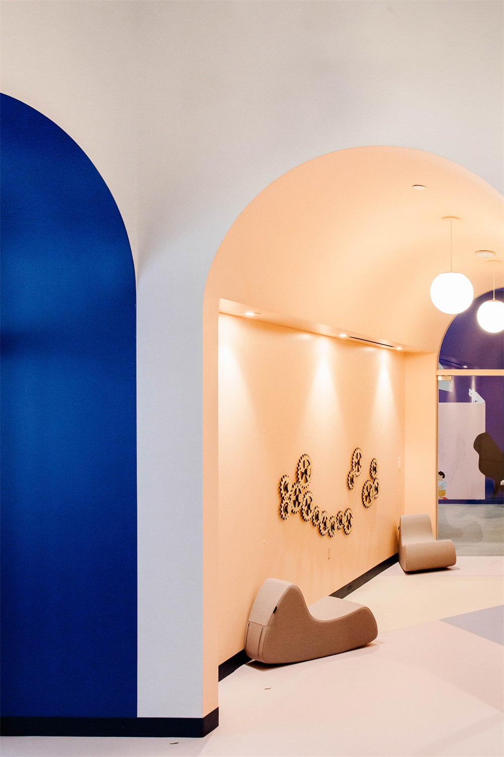 The 8,060 square-foot (743 square metres) space includes three different classrooms, each with a different function: creative playroom, art lab and library. These are located closer to the facade, where there is the most light for active play. All of these classrooms open onto a central space, dubbed the “playground”.Smaller rooms that receive indirect light are then used as areas for quiet play or nap time. For families, there is a lounge, enrichment studio, and a quiet space, where adults can book rooms for meetings.