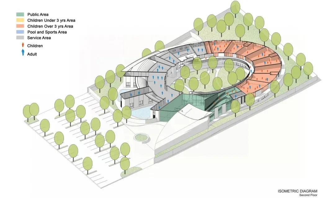 在建筑内部,各种不同的空间被创造出来,以适应不同的功能。健身房下的半户外空间被设置为游泳池,从墙面到天花板的平滑连接面与末端的绿化景观营造出洞穴般的空间,让孩子们产生冒险的感觉。无柱式的巨大空间设计,使健身房的功能更加灵活,成为孩子们的自由玩耍空间。位于建筑狭长处的教室,是将自然带入学习空间,让所有的孩子在树丛中学习。