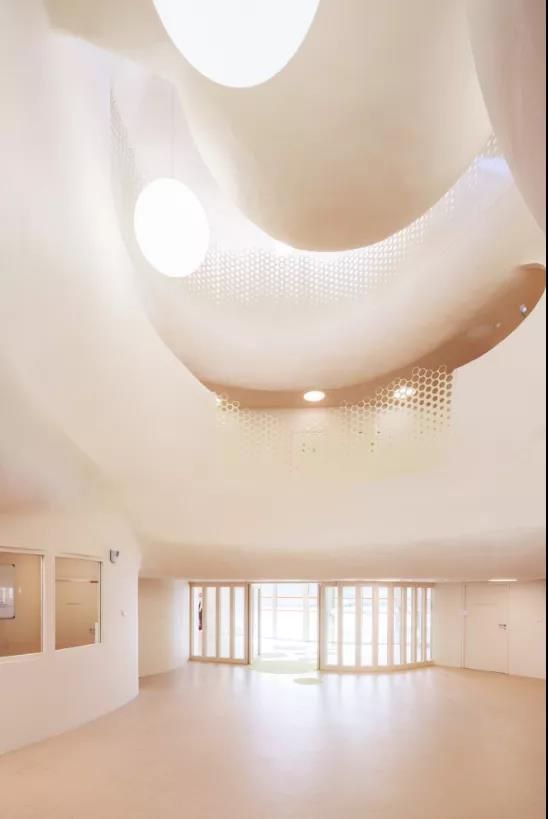 多功能托儿室是圆形的,半球形天花,小学是方形和金字塔天花板。这两个巨大的空间是完美的游戏场所,得益于巨大的架空层,光照充足。此外,走廊上的镂空设计,有助于自然光在的室内的传导,使建筑内外更佳通透。